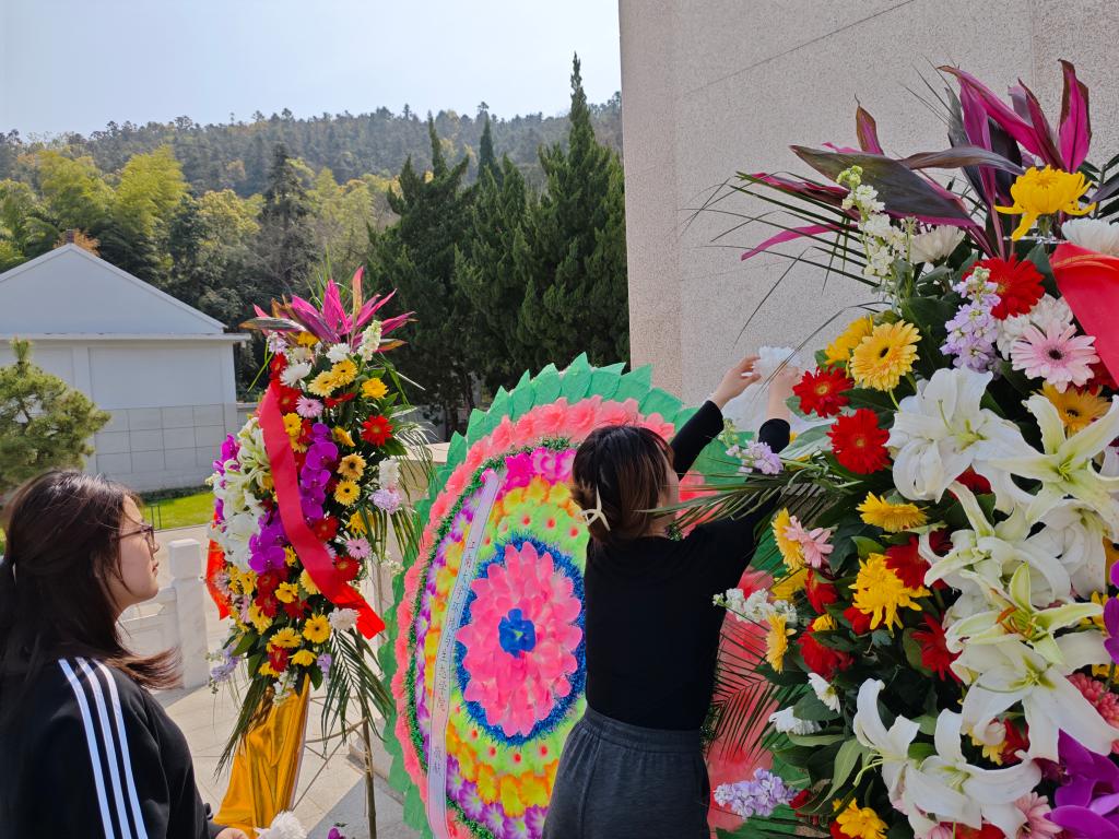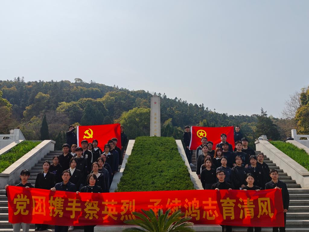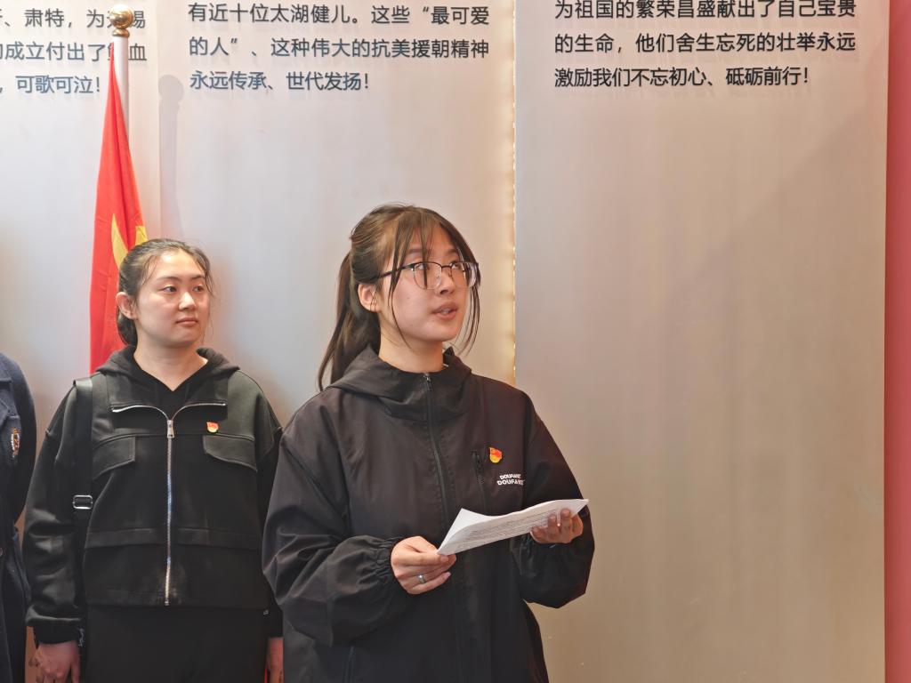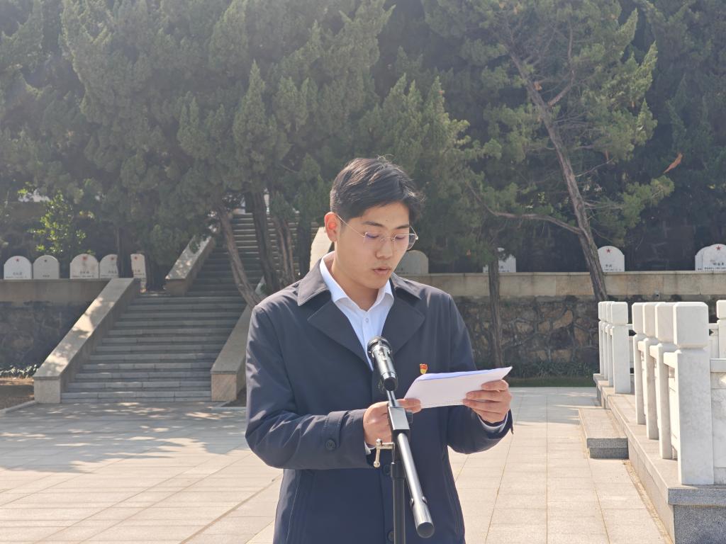 衡延笃作为教师代表发言,他讲述了父亲一辈抗战的经历,介绍了发生在无锡的重要事件;他强调,伟大的抗战精神已经传递到青年一代手中,作为新时代的大学生,要在追求知识的道路上,以英烈为榜样,树立远大理想,将个人的成长与国家的命运紧密相连。学生党员代表陈云帆用“铭记、传承、担当”三个关键词分享了自己的感悟。入党积极分子章涵表示要以本次祭扫活动为契机,铭记英烈志,以科学之光照亮未来,在建设美丽中国的征途上,让红色基因与绿色使命交相辉映!。