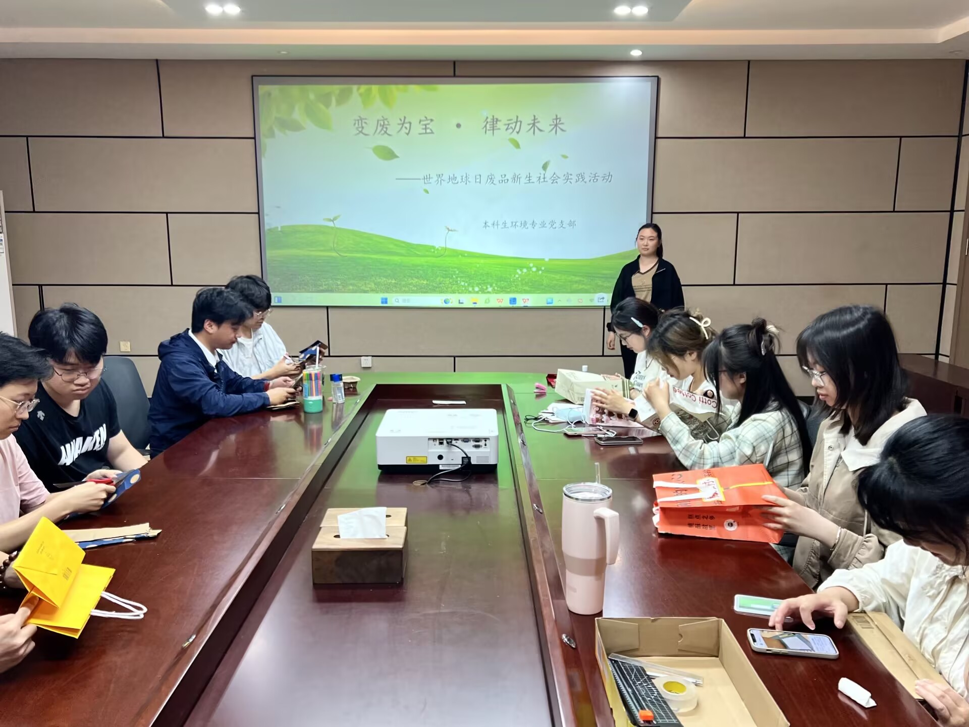 紧接着,由崔怡菲组织号召的充满创意的“变废为宝·绿动未来”活动火热开展。早在地球日前一周,党员们就积极响应号召,在日常生活中收集奶茶袋、奶茶杯、快递盒等废品。活动现场,大家纷纷拿出自己的“宝贝”,剪刀、胶棒齐上阵。不一会儿,奶茶袋变成了时尚的小花篮,快递盒变身实用的桌面收纳盒,纸杯纷纷变身成为桌面小垃圾桶。大家相互交流创意,分享制作心得,欢声笑语中,一件件精美的手工艺品诞生。这些作品不仅展示了党员们的奇思妙想,更传递出资源循环利用的环保理念。