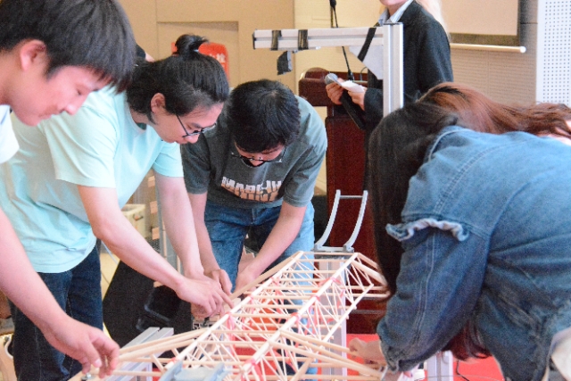 环境与土木工程学院第六届“扬建党100周年之帆,载凝结创意之梦”结构模型加载大赛决赛在北区大学生活动中心顺利举行。大赛由环境与土木工程学院土木工程系王登峰、刘文化、俞设、成虎老师担任评委。2019级、2018级土木工程专业学生共组成22支队伍参赛。
