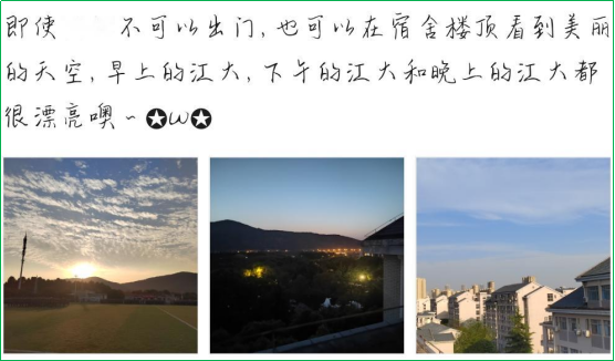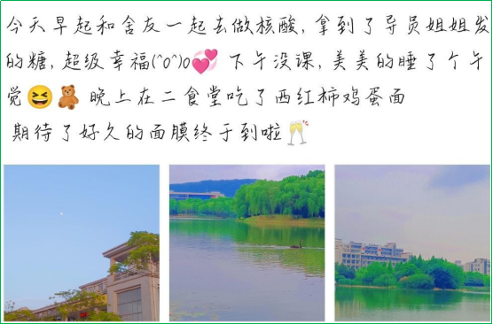 全体学生,以弘扬乐观向上的生活态度为主要目的,以“遇见光-追寻光-成为光-散发光”为主线,引导同学们去发现、去记录、去分享自己在平淡生活中的小确幸——可能是图书馆午后和煦的阳光、可能是小蠡湖畔交颈嬉戏的天鹅、可能是食堂阿姨多给的一块红烧肉、可能是大众书局超赞的一份水果拌、也可能是苦苦思索后成功解答的一道高数题……在十几天的打卡过程中,来自10余个学院的百余名同学积极参与,打卡千余次,与大家分享了自己生活中的小确幸,传递了触动人心的爱与温暖,他们对生活的乐观和热爱也感染了很多身边的同学。来自环境科学专业的康同学说:“原来生活不只是每日的核酸和线上的网课,还有清晨窗边跳跃的阳光,还有西北操场上缓缓稀释的橘色夕阳,我们还是要保持乐观的心态,善于发现生活中那些细微的热爱,善于记录生活中那些动人的温暖,学会作为一缕微光,滚烫自己,温暖他人。”来自汉语言文学专业的王同学说:“当你带着忧虑眼镜去看世界的时候,一切都是灰暗的。当你带着闪光眼镜去看世界的时候,就连烦恼都是闪闪发光的,生活是不因我们的意志所改变的,但是面对生活的乐观态度却是我们可以培养的,我们要培养理性平和的生活态度,去发现生活中的闪光点。”