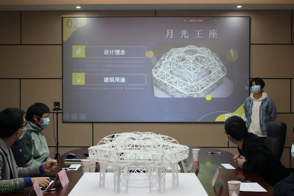 主持人首先介绍了决赛的流程和评分细则。决赛采用团队展示与答辩相结合的方式,每组团队进行3分钟模型构造设计展示,阐述建筑模型设计理念、模型结构介绍等。接着由每组团队的三位代表进行答辩,评委对每个模型的制作工艺、力学原理、实际应用、材料环保性进行多方面综合考量,并对选手进行现场提问,指出各个结构的优势和存在的不足。