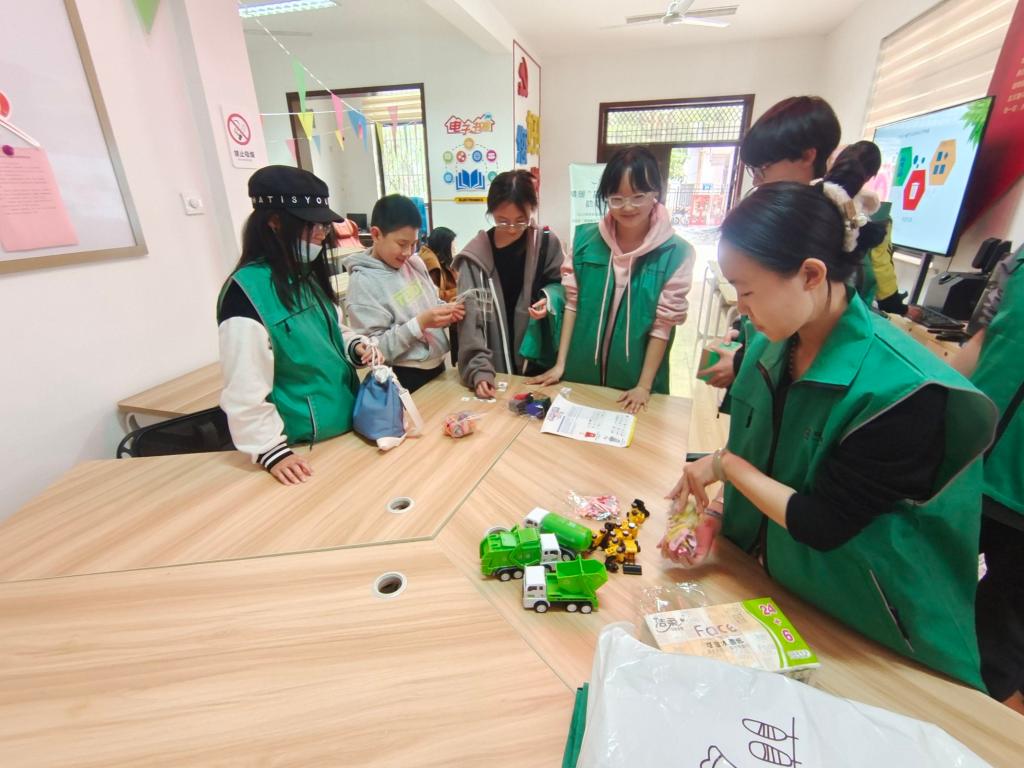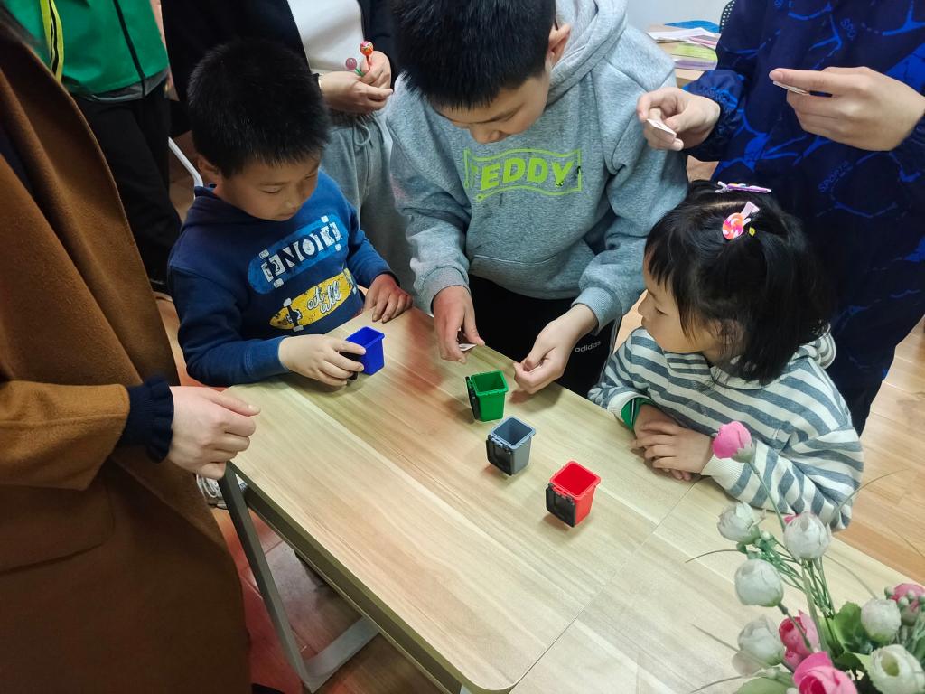 然后在PPT讲解完毕,志愿者又进行了垃圾分类的益智游戏。志愿者们将小朋友们分成两组,每组四人。两组队员需要在规定的时间内将卡片上的物品放入相应的垃圾桶,志愿者按照答案检查物品的归类是否正确,正确则记一分,最终比分高的队伍获胜。小朋友们对活动表现出了超乎寻常的兴趣,他们围绕着桌子进行激励的讨论。活动以40:42的比分结束。在分发奖品时,志愿者们为获胜组的小朋友们颁发了奖品,而另一组也获得了安慰奖,希望能激励他们更多的去了解环境知识,更多地参与环保活动。