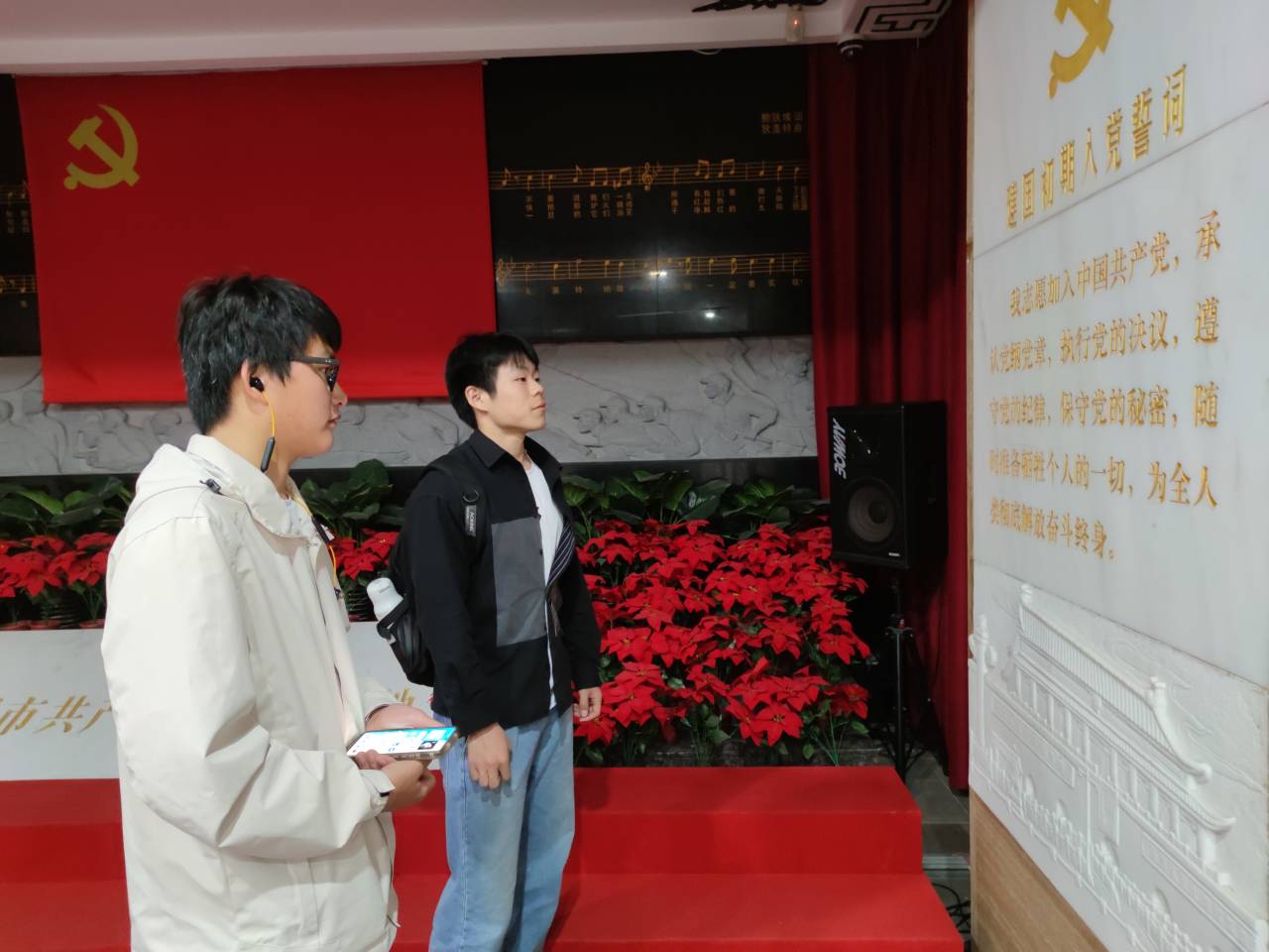 往后面走,眼前出现了一座古色古香的小楼——多寿楼,上面挂了一幅牌匾,写着“第一支部”。走进内部一瞧最夺目就是“中国红”的宣誓大厅,刻着国歌的黑色墙面上是庄严且神圣的国旗。往旁边看,四块大理石上则分别刻着红军时期、抗日战争时期、解放战争时期、建国初期的入党誓词,一切都显得那么庄严且雄然。队员们齐声读着誓言,耳边仿佛响起了当时革命先烈在这里铿锵有力的宣誓声。