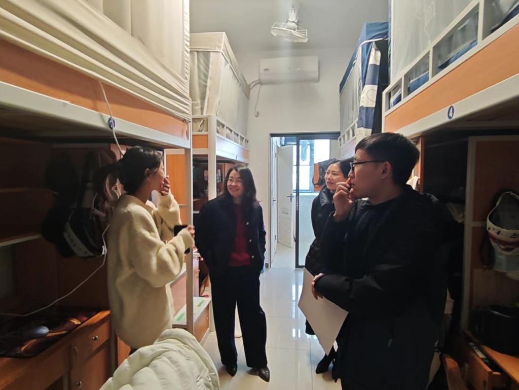 走访期间,学院老师与同学们亲切交谈,细致询问假期生活、返校适应情况及新学期学业规划。胡娟在走访中特别关注宿舍安全情况,她叮嘱学生们在日常生活中如遇到安全问题要及时向保卫处和辅导员反映,每进入一间宿舍,都强调要定期打扫宿舍卫生、注意用水用电规范、严禁使用违章电器。辅导员重点关注学生们的课程安排和学习计划,鼓励大家合理安排时间,积极参与实习实践、科研竞赛和学院文体活动。