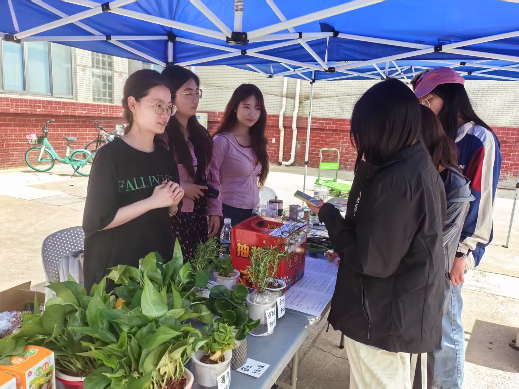 同学们可以凭借旧衣物、书本、纸箱、易拉罐等闲置物品,通过称重兑换“绿色积分”。工作人员依据废品种类与重量进行换算,如每5公斤纸质类废品可兑换5元额度,参与者凭积分自由挑选多肉、绿萝、薄荷、非洲菊等十余种绿植。一摞旧书、几件旧衣,在称重后即可变成生机盎然的盆栽植物,不仅减少了资源浪费,也为同学们的日常生活增添了一分自然气息。