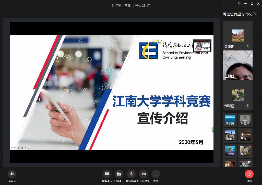 学科竞赛工作,激发教师参与大学生学科竞赛指导工作的积极性,2020年5月13日下午,环土学院利用企业微信平台召开2020年学科竞赛推进会。院党委副书记兼副院长金明媚、学院学工办主任蒋达锋、学院各科研团队教师代表参加会议。辅导员周佳赟主持会议。