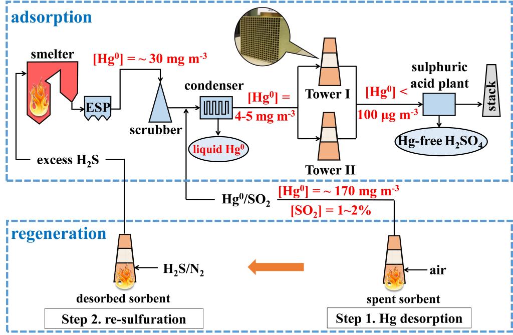 该团队研究发现利用气态硫化氢与过渡金属氧化物反应(CuO/TiO2、MoO3/TiO2和Fe2O3/TiO2),可在其表面修饰一层过渡金属硫化物如CuS(Environ. Sci. Technol. 2018, 52, 10003-10010)、MoS3(Environ. Sci. Technol. 2019, 53, 4480-4489)和FeS2(Environ. Sci. Technol. 2020, 54, 586-594)。研究发现这些过渡金属硫化物具有优异的从冶炼烟气中吸附高浓度气态零价汞的性能,为此该团队提出了利用可再生的整体式二氧化钛负载的过渡金属硫化物吸附剂回收冶炼烟气中零价汞的新思路(见图1)。
