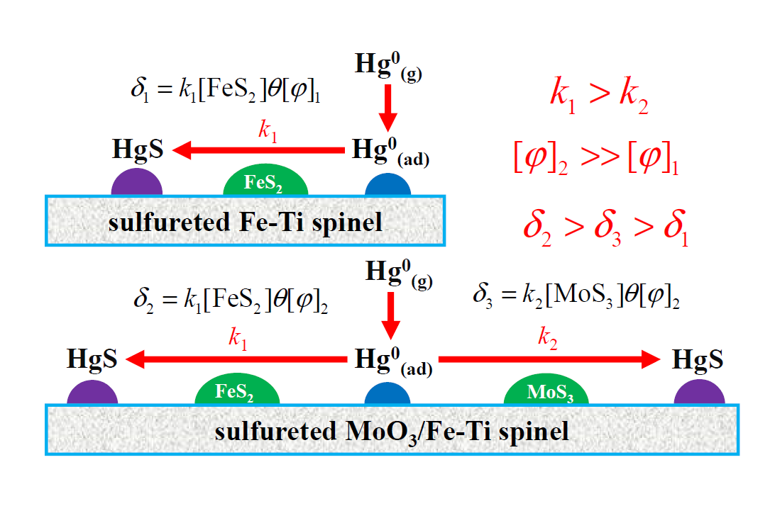但是二氧化钛负载单一过渡金属硫化物吸附剂吸附气态零价汞的性能一般,为此该团队基于气态零价汞在过渡金属硫化物表面化学吸附机制建立了吸附动力学模型,通过比较吸附动力学参数揭示了过渡金属硫化物吸附气态零价汞性能的构效关系。在此基础上,通过不同过渡金属硫化物的复合产生协同效应(见图2),设计出了具有更加优异的从冶炼烟气中回收气态零价汞性能的可再生金属硫化物吸附剂如FeMoSx/TiO2(Environ. Sci. Technol. 2020, 54, 586-594)、硫化MoO3/Fe-Ti spinel(Environ. Sci. Technol. 2020, 54, 7659-7668)和MoSx@γ-Fe2O3(Environ. Sci. Technol. 2020, 54, 1992-2001)。