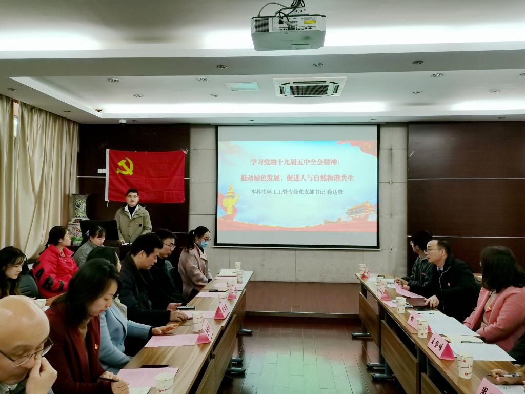 本科生环工工管专业党支部书记蒋达锋带领大家学习了党的十九届五中全会公报中有关“推动绿色发展,促进人与自然和谐共生”的要点及会议精神,呼吁党员要树立为祖国绿水青山事业添砖加瓦的使命感和责任感,以更加饱满的热情和激情,从自身做起,从点滴做起,推动形成健康文明生产生活方式,共同推进生态文明建设。