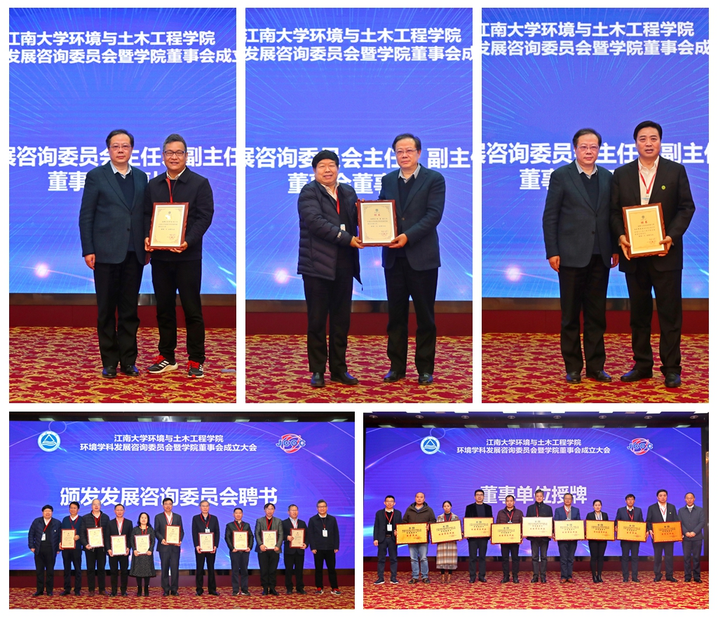 朱飞主任、黄敏处长为董事单位授牌。江苏金山环保工程集团担任环境与土木工程学院董事会董事长单位,无锡新视野环保有限公司、江苏江达生态环境科技有限公司、赢特环保科技(无锡)有限公司、无锡马盛环境能源科技有限公司、无锡市东方环境工程设计研究所有限公司担任学院董事会副董事长单位,无锡恒诚水利工程建设有限公司担任常务董事单位,南通润泽环境工程技术有限公司、苏州苏沃特环境科技有限公司担任学院董事会董事单位。