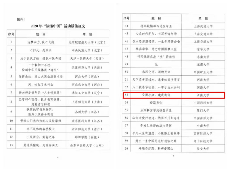 近日,教育部关心下一代工作委员会公布了2020年“读懂中国”活动评审结果,环境与土木工程学院研究生唐洁雨提交的征文《全面小康,建成有你》荣获2020年“读懂中国”活动最佳征文(全国仅60项)。