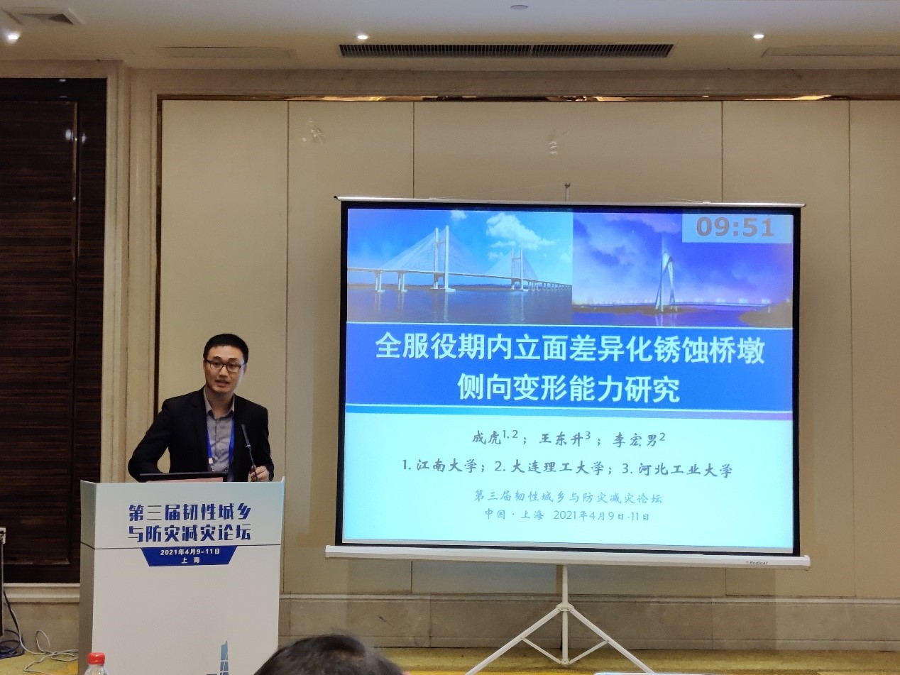 土木系青年教师付李、王城泉、成虎、杨兰兰和王龙等参会,重点关注了“城市基础设施抗震韧性评价与韧性提升”、“地震可恢复功能结构新体系及设计理论”和“地震灾害风险评估与韧性城乡防灾”等议题,与各位同行专家展开了深入的交流和探讨。成虎和杨兰兰两位教师分别就“全服役期内立面差异化锈蚀桥墩侧向变形能力研究”和“高精度匹配设计反应谱的影响矩阵方法”作了专题报告,引起了与会人员的广泛关注。