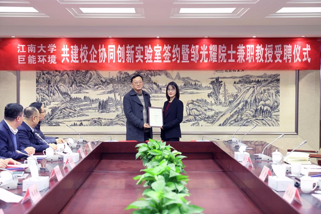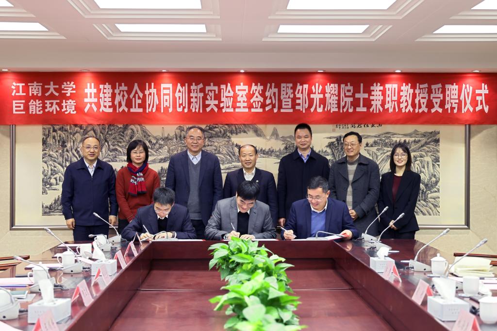 —巨能环境共建校企协同创新实验室签约暨邹光耀院士兼职教授受聘仪式。浙江巨能环境工程有限公司总经理凌明、副总经理姚海勇、郭慧,金宝娱乐城官网-金宝娱乐城JINBAO CASINO