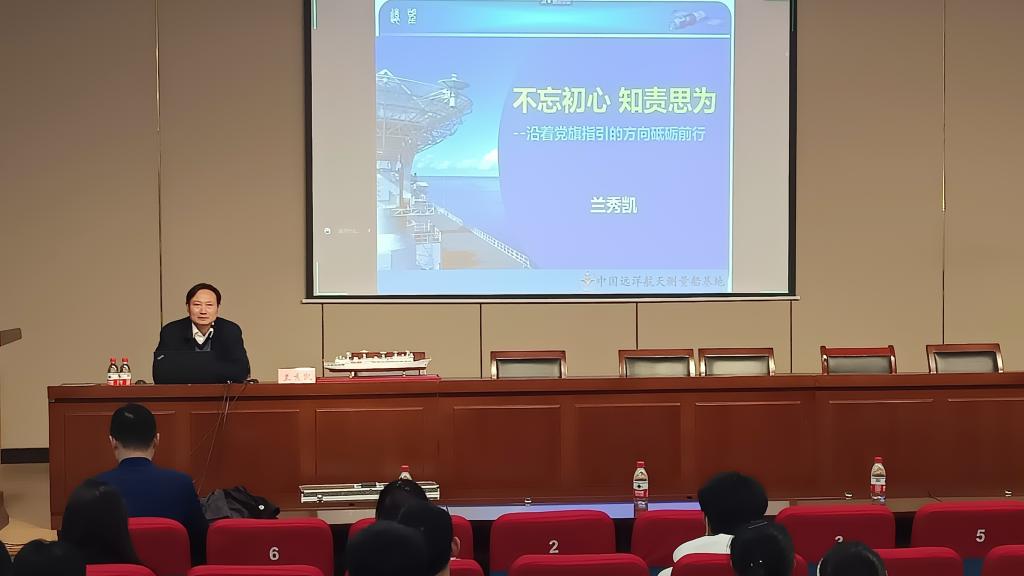 兰秀凯担任过我国十大名船之一的远望号船长,一直致力于我国的远洋、水利事业,无论在军旅生涯,还是在地方工作,始终一丝不苟、忠诚奉献。几十年如一日,他在平凡的岗位作出了伟大的贡献。兰秀凯对中交天航局成立125年来的辉煌历程和骄人业绩表示赞许,并把“战风斗浪、开拓向前”的“天航精神”和“奉献、团结、拼搏、严谨、开拓”的“远望精神”相结合,以多年的工作经历和亲身感受,从远望号的基本情况、“远望精神”的基本内涵以及身边优秀的远望人三个方面,用幽默活泼、饱含诗意的语言为全体师生讲授了一堂激情澎湃、妙趣横生、感人至深的理想信念教育课、思想政治课、爱国主义教育课。他最后为全体师生送出“十个有”的人生寄语,即有声有色的工作、有滋有味的生活、有情有义的交往、有张有弛的学习、有规有矩的坚守。