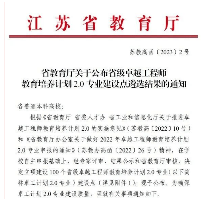 卓越工程师教育培养计划2.0是江苏省教育厅依据《教育部工业和信息化部中国工程院关于加快建设发展新工科实施卓越工程师教育培养计划2.0 的意见》(教高〔2018〕3号)等文件精神,推进实施全面深化高等工程教育改革的重要举措,立项100个省级卓越工程师教育培养计划2.0专业建设点。
