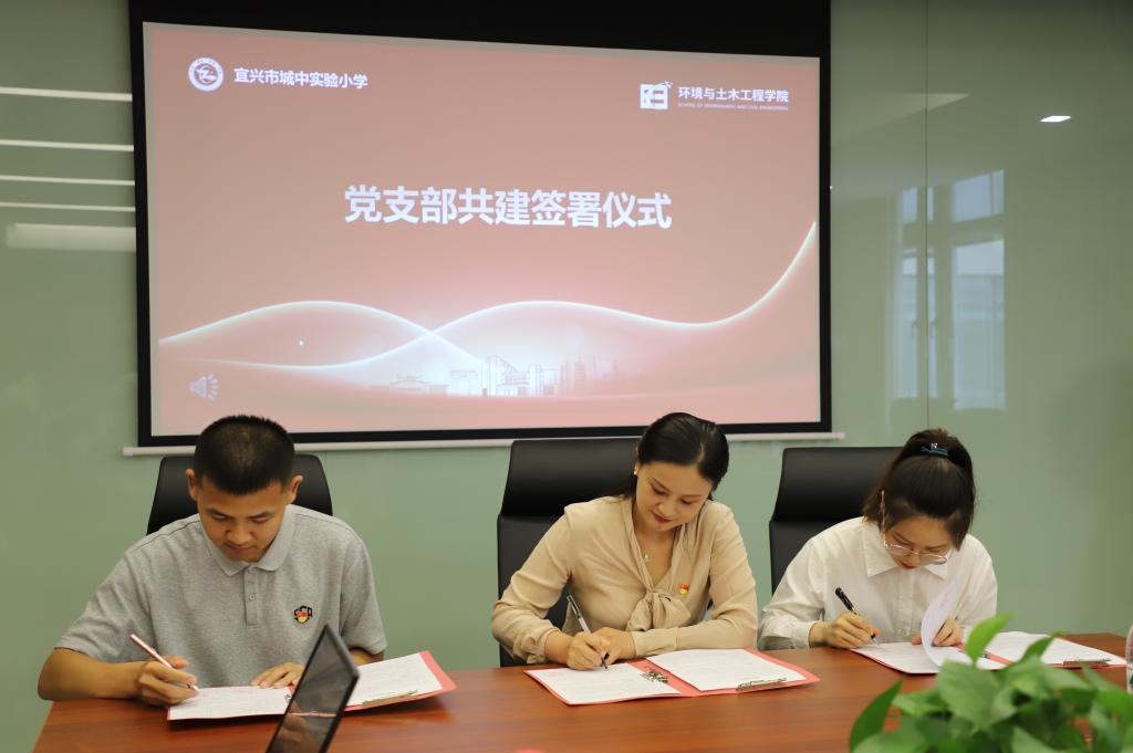 宜兴城中实验小学党支部书记马进、环境与土木工程学院教工环境二支部书记郁红艳、东氿校区研究生第一、第二党支部书记万骋宇、毛雪莲共同签署了党支部共建合作协议,希望通过整合资源,充分发挥各自优势,资源共享,以优质党建推进金宝娱乐城官网-金宝娱乐城JINBAO CASINO