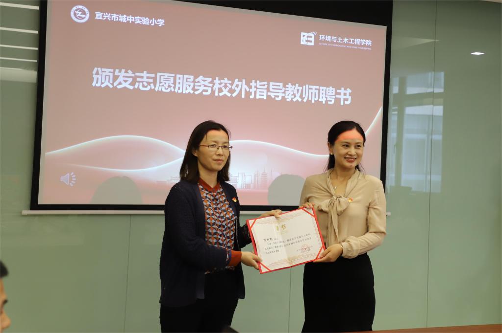环境与土木工程学院和宜兴市城中实验小学的高质量协同发展,共同推进基层党建工作。党建联盟授牌仪式上,马进向学院赠送“有光红盟”牌子,并为郁红艳颁发宜兴市城中实验小学志愿服务校外指导教师聘书。