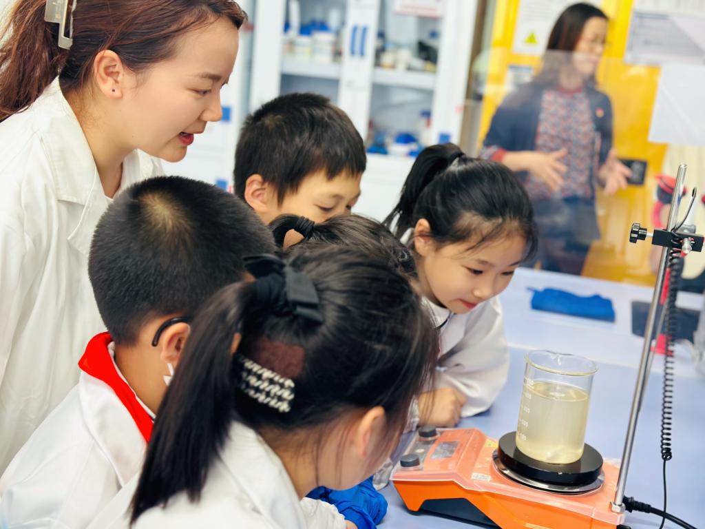 会场结束后,在志愿者的引导下,同学们前往实验室进行参观学习。随后志愿者将小朋友们分成四组,给同学们演示河水混凝净化实验,带同学们观察河水中胶体物质的混凝沉淀现象,了解河水水质混凝净化机理,并带领同学们自己动手操作实验,感受实验的乐趣。