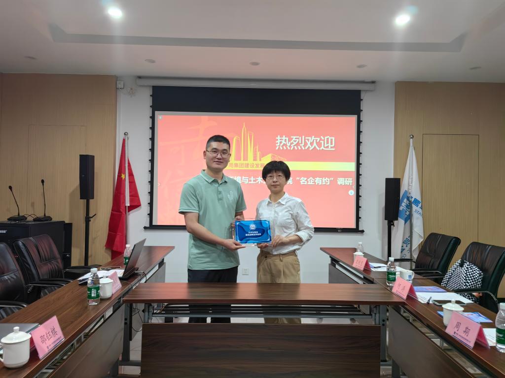 何涛介绍了学校及学院的基本情况,阐明了“名企有约”走访调研的目的和意义。他进一步了解校友在企业的职业发展情况,希望在现有基础上拓展校企合作空间,深化校企联动,助力人才培养。会上,何涛代表环境与土木工程学院为中建一局建设发展公司颁发了“大学生就业最佳战略合作伙伴”铭牌。