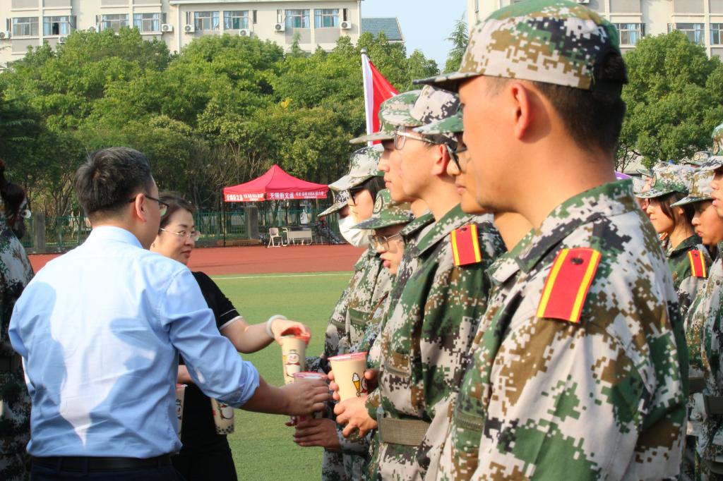 学子的优秀风貌。随后,学院党政领导亲自为“每日军训之星”送上奶茶,领导亲临前线无不体现出学院对学子的关怀和挂念。最后,参会人员进行大合照,剩余同学在教官的指挥下有序领取奶茶,笑容在学子的脸上绽放。