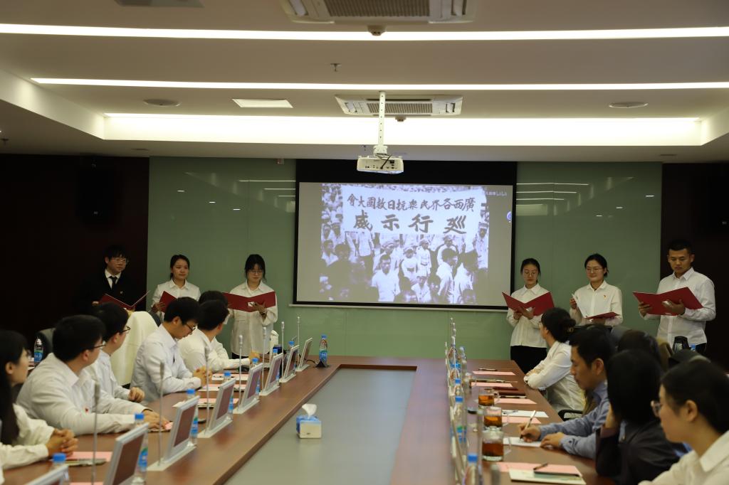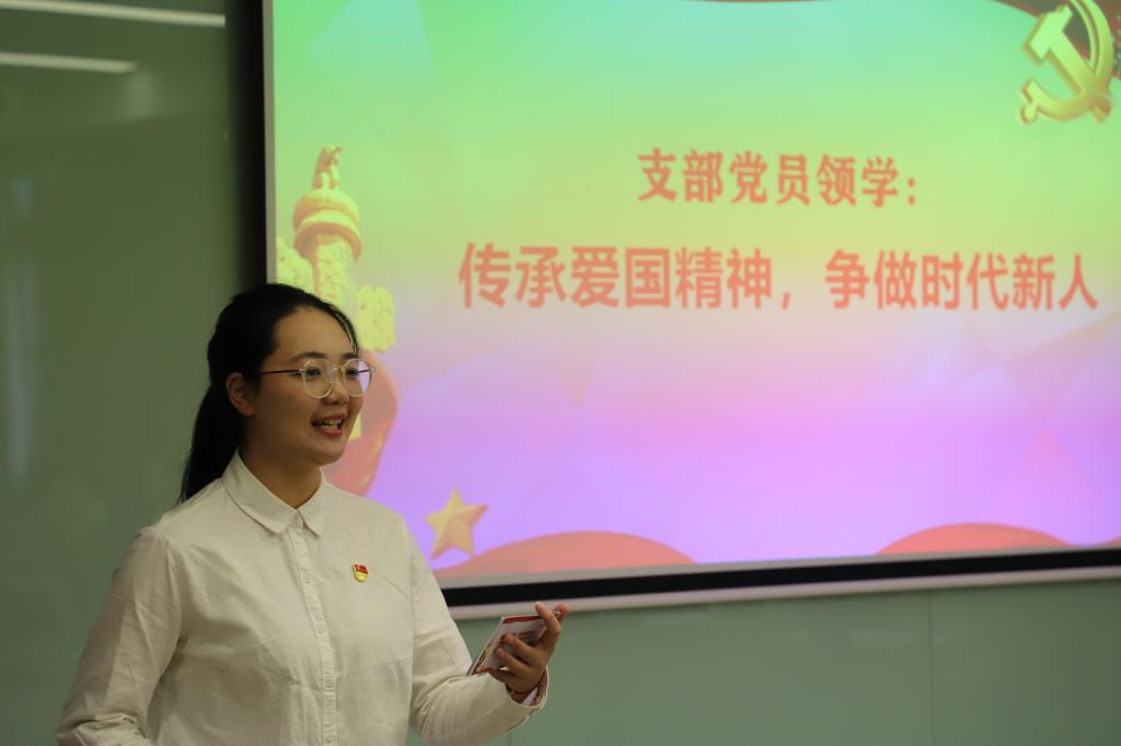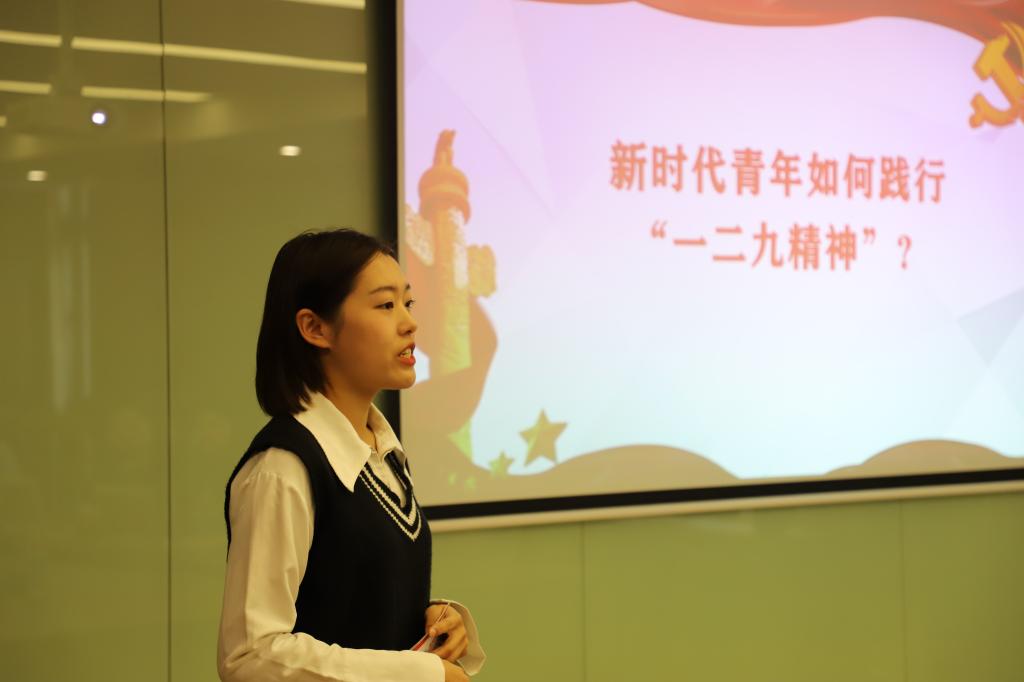 一二·九运动中青年学生展现最强烈的就是爱国主义精神,研究生第一党支部党员兰金燕和叶子婷同志围绕“传承爱国精神,争做时代新人”进行领学,回顾了“一二·九运动”并阐明新时代青年应该发扬以爱国主义为核心的“一二·九”民族精神,要牢记青春使命,坚定理想信念,立志报效祖国,勤于学习和实践,勇于开拓创新。为了走进那段激昂的历史,万骋宇、刘婉静、敖涛等同志带来朗诵《一二九运动:青年一辈发出时代先声》,铿锵之声展现了一二·九运动的伟大民族精神,让在场的党员为之震撼。