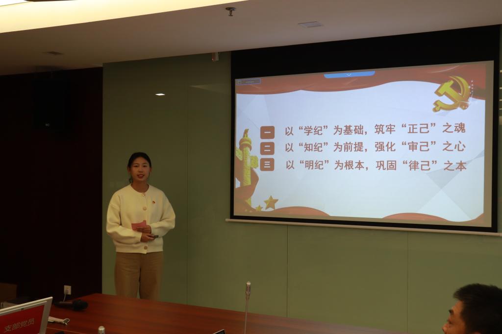 郁红艳讲授党课《党建引领铸魂育人,导学思政启智润心》,为在场党员讲授了一堂深刻的党课,她强调导师是研究生成长成才的指导者和引路人,肩负着培养国家高层次创新人才的使命与重任,要积极探索导学关系新模式,不断深化导学思政内涵,拓展导学互动场景,营造导学和谐氛围,创建和谐导学关系,构筑育人共同体。研究生第四党支部党员么家雪同志以《严守党纪党规,筑牢廉洁防线》为题领学党纪党规的相关内容,并通过纪法小课堂和知识问答来加深大家的理解。杨白雪以《守纪律讲规矩,做新时代先锋》为题,阐述了守纪律讲规矩的核心要求、重要意义和关键举措,以及新时代青年应该如何践行。