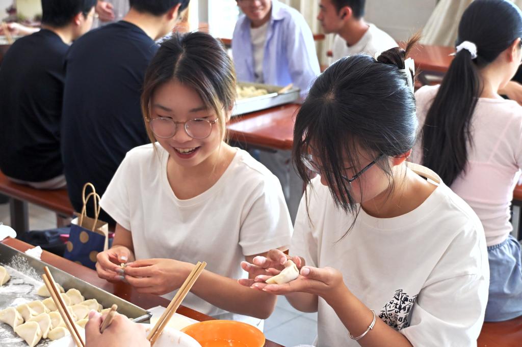 活动现场充满了浓浓的节日氛围,食堂工作人员提前准备好了新鲜的食材,同学们迅速投入到包饺子的欢乐之中。活动开始后,同学们自发结成小组,热情投入其中:有人手法娴熟,一捏一合间玲珑饺子便跃然掌上;有人虚心求教,在工作人员以及老师的指点下渐入佳境;还有人别出心裁,尝试着捏出不同形状的创意饺子,引来阵阵欢笑。同学们边动手边交流,畅谈家乡的端午习俗,分享学业心得与未来理想。欢声笑语间,一个个形态各异的饺子摆满了托盘,承载着大家满满的热情与期待。