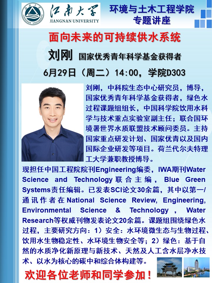 【讲座信息】面向未来的可持续供水系统——刘刚(国家优秀青年科学基金获得者)