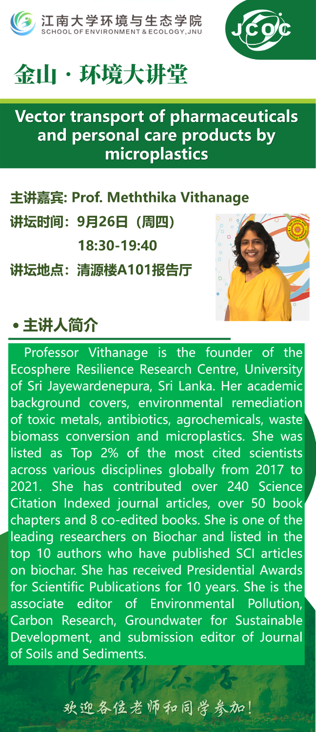 金山•环境大讲堂——Prof, Meththika Vithanage:Vector transport of pharmaceuticalsand personal care products bymicroplastics