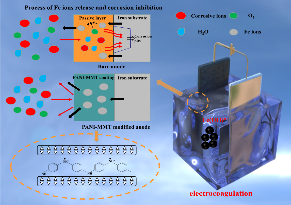 针对电絮凝系统中缓蚀现象的成因,我校环境与土木工程学院严群教授团队提出了用修饰涂层保护阳极板,进而有效抑制极板表面腐蚀情况的解决方法。经过实验对比,最终确定了用PANI (聚苯胺)-MMT (蒙脱土)材料进行极板修饰,并测试了涂覆后的极板的电化学性能以及多批次实验后的处理重金属效果,最终证实涂层修饰可以有效保护极板,延长使用寿命,稳定去除效果。