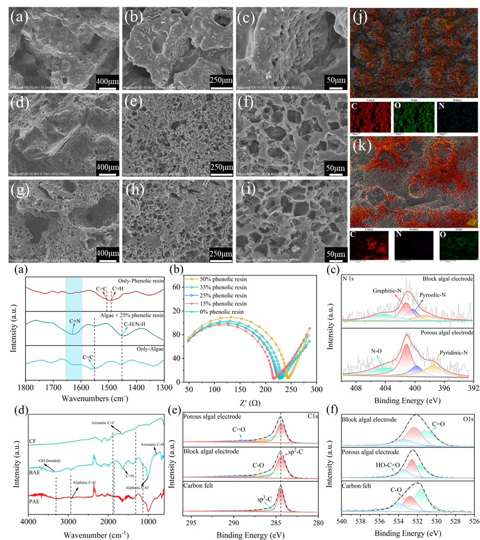 为解决这一问题,本研究采用酚醛树脂交联和碳酸钙模板改性技术(图1),将富含氮、氧元素的废弃蓝藻生物质升级为具备发达孔隙结构和优异电催化性能的三维多孔电极材料(图2)。这一新型三维多孔蓝藻电极(PAE)具备改良的氮掺杂结构、丰富的含氧官能团以及平均孔径约为70微米的大孔结构,显著提升了电极的微生物负载能力和电催化活性。